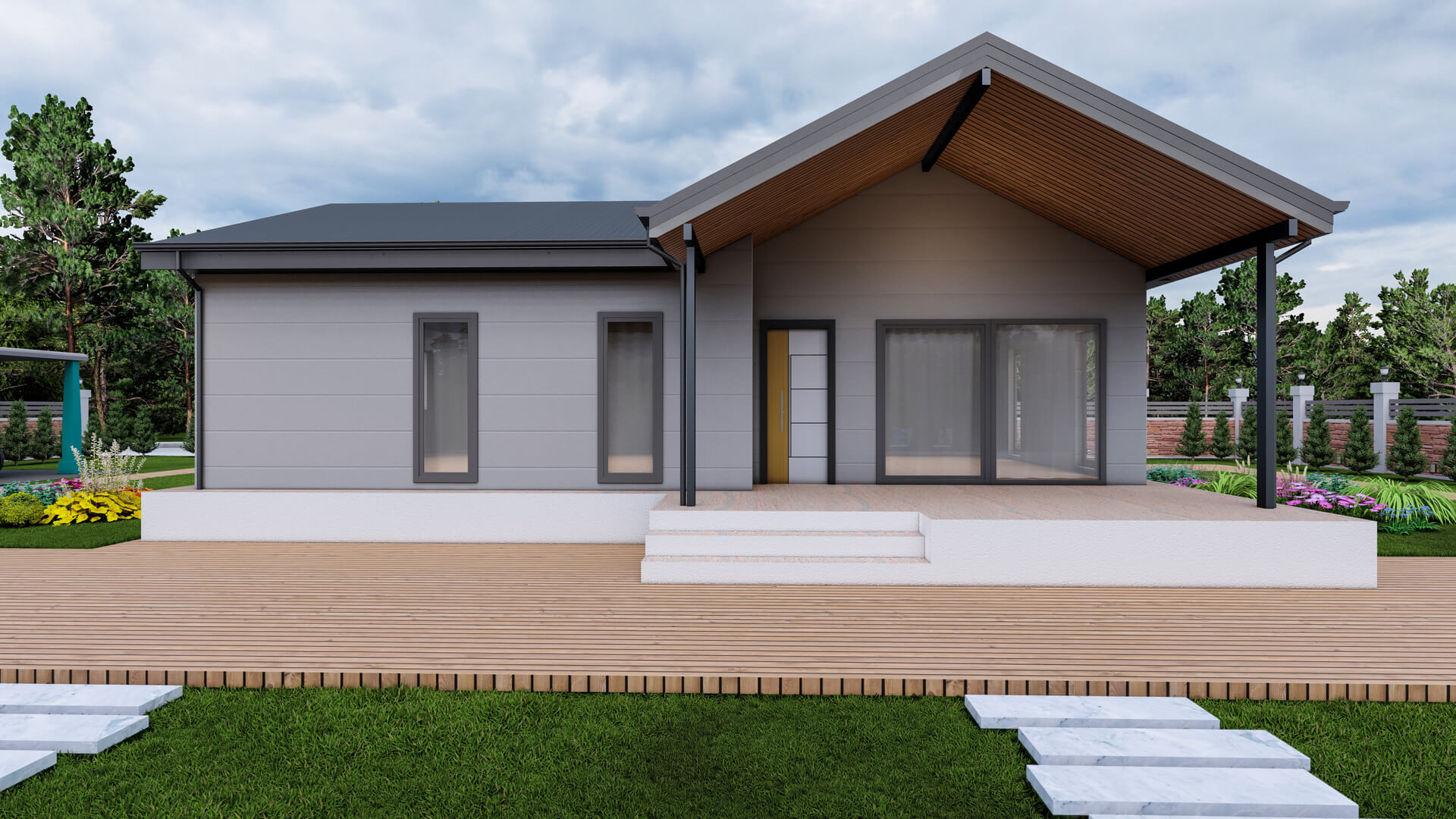 115 m²’lik bu çelik ev modeli, modern mimarinin sade ve şık çizgilerini taşıyan kompakt fakat oldukça kullanışlı bir yaşam alanı sunar. Zemin katta yer alan ferah salon, mutfak ve yemek alanı bütünleşik bir yapıda tasarlanarak aile içi etkileşimi artırır ve mekânın daha geniş algılanmasını sağlar. Büyük pencereler doğal ışığın içeri bolca girmesine imkan verirken, veranda ya da teras alanı dış mekânla güçlü bir bağlantı kurar; böylece hem iç hem dış yaşam alanı dengeli bir şekilde kullanılabilir hale gelir.