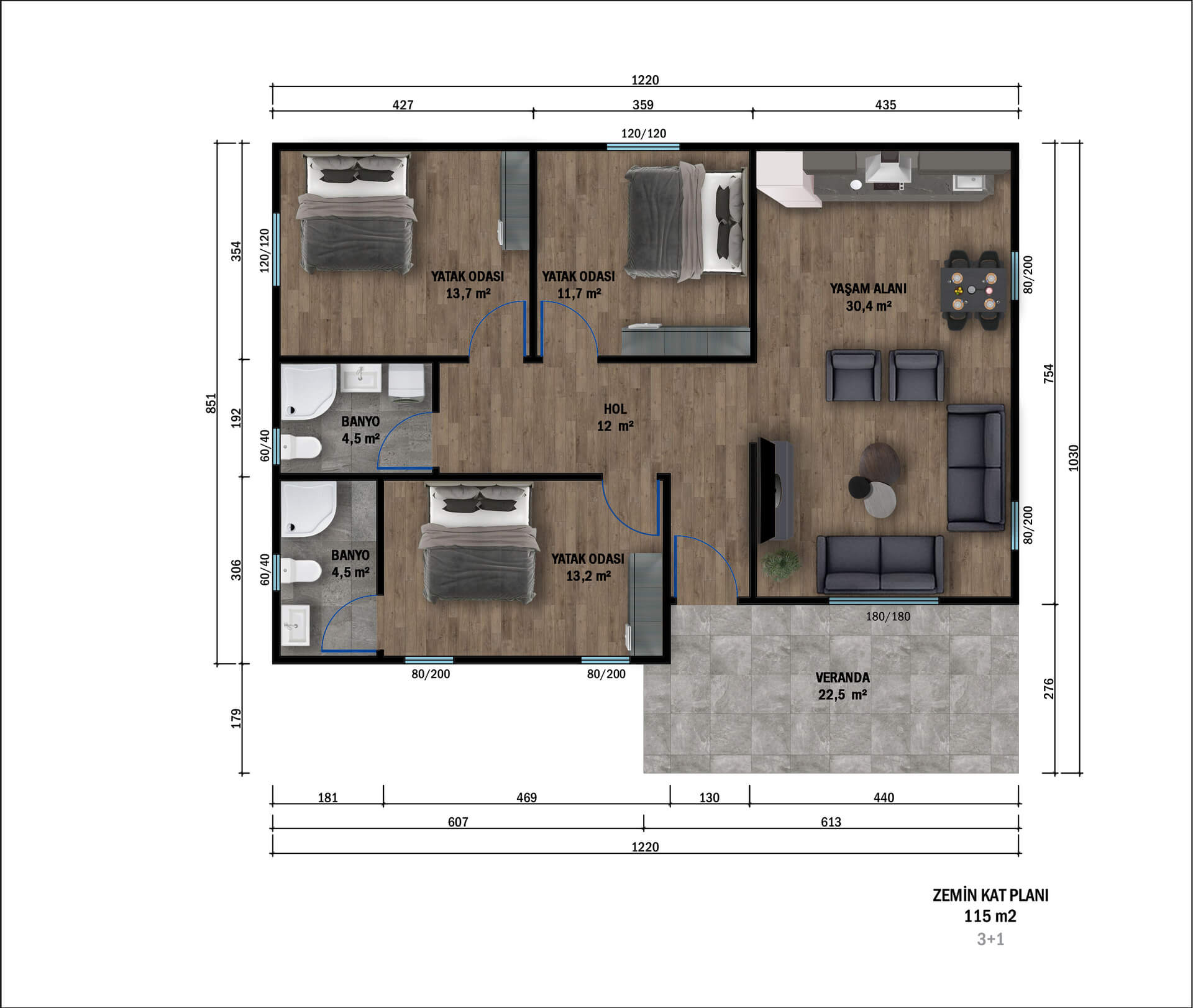 115 m²’lik bu çelik ev modeli, modern mimarinin sade ve şık çizgilerini taşıyan kompakt fakat oldukça kullanışlı bir yaşam alanı sunar. Zemin katta yer alan ferah salon, mutfak ve yemek alanı bütünleşik bir yapıda tasarlanarak aile içi etkileşimi artırır ve mekânın daha geniş algılanmasını sağlar. Büyük pencereler doğal ışığın içeri bolca girmesine imkan verirken, veranda ya da teras alanı dış mekânla güçlü bir bağlantı kurar; böylece hem iç hem dış yaşam alanı dengeli bir şekilde kullanılabilir hale gelir.