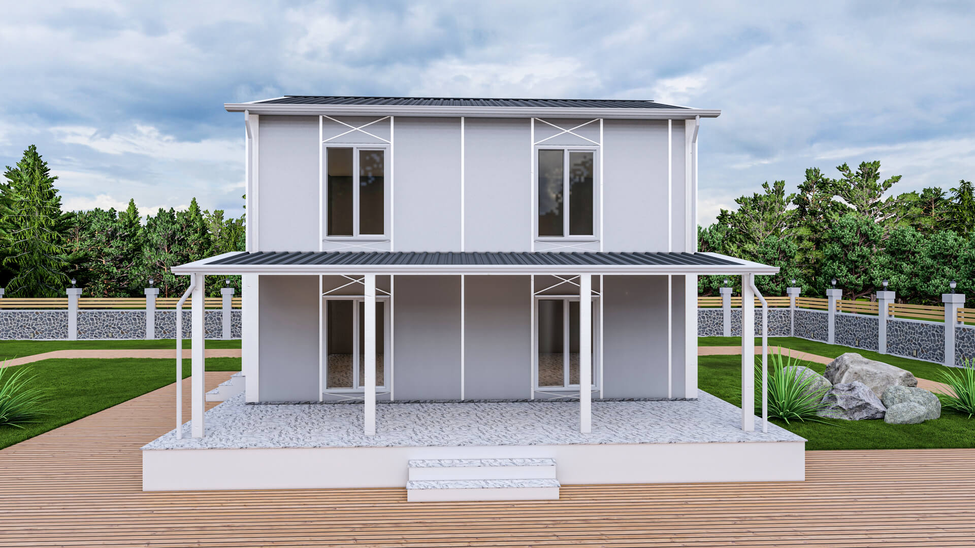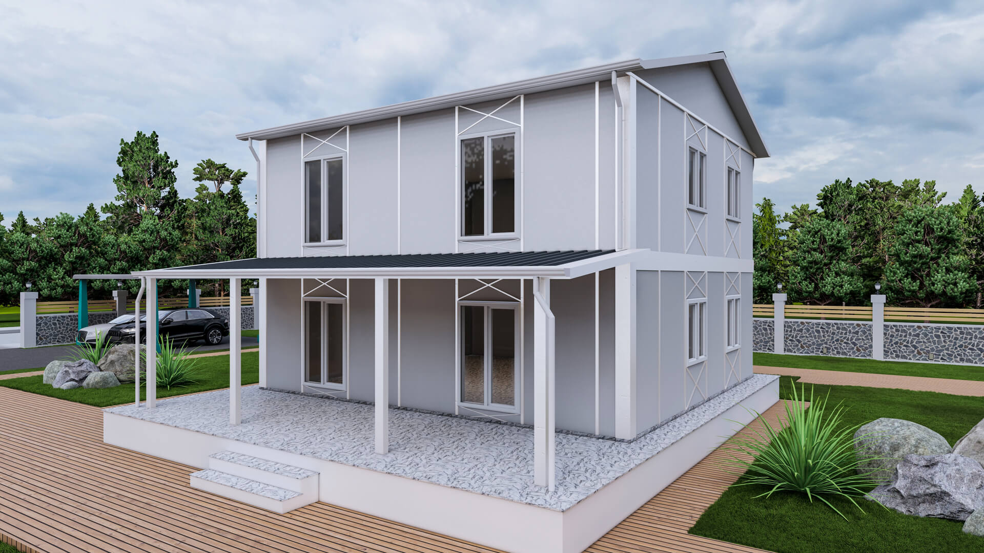132 metrekarelik prefabrik ev, geniş ve kullanışlı iç mekan düzeniyle aile yaşamı için ideal bir konfor sunar. Ferah salon, pratik bir mutfak ve birden fazla oda seçeneğiyle yaşam alanlarının rahat bir şekilde planlanmasına olanak tanır. Büyük pencereler sayesinde doğal ışık evin her köşesine ulaşır, bu da iç mekâna sıcak ve davetkâr bir atmosfer kazandırır. Modern dış cephe tasarımı ise hem şehir içinde hem de doğanın içinde estetik bir duruş sergiler.