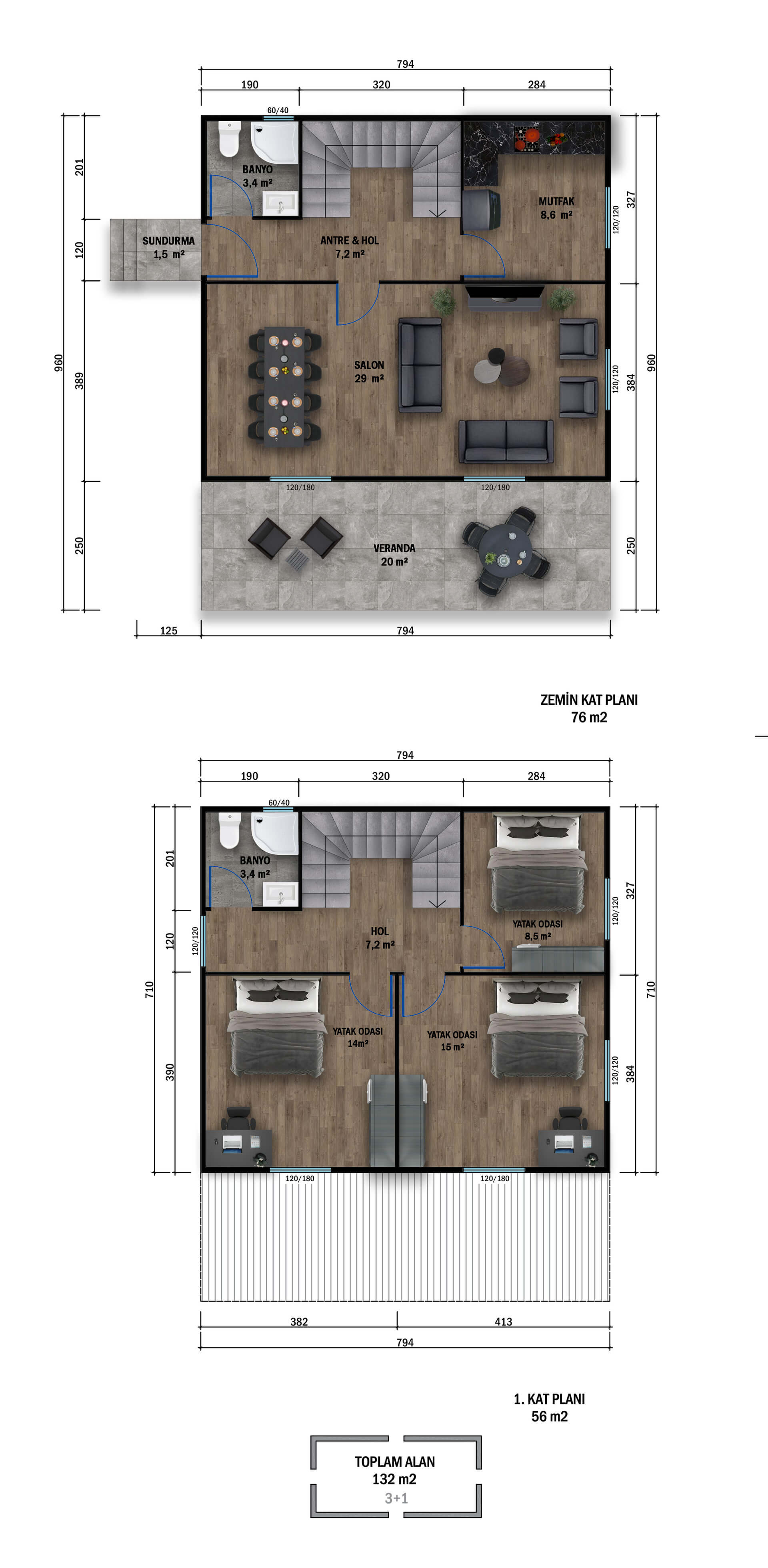 Prefabrik yapım teknolojisinin avantajlarını taşıyan 132 metrekarelik bu ev, hızlı kurulum süresiyle kısa zamanda yaşamaya hazır hale gelir. Dayanıklı malzemelerden üretilmiş olması sayesinde uzun yıllar güvenle kullanılabilir ve yüksek yalıtım özellikleri sayesinde her mevsim ideal sıcaklık korunur. Enerji tasarruflu yapısı hem bütçeye katkı sağlar hem de çevre dostu bir yaşam sunar. Hem estetik hem fonksiyonel bir yaşam alanı arayanlar için bu ev modeli, konforlu ve dengeli bir ev düzeni sağlar.